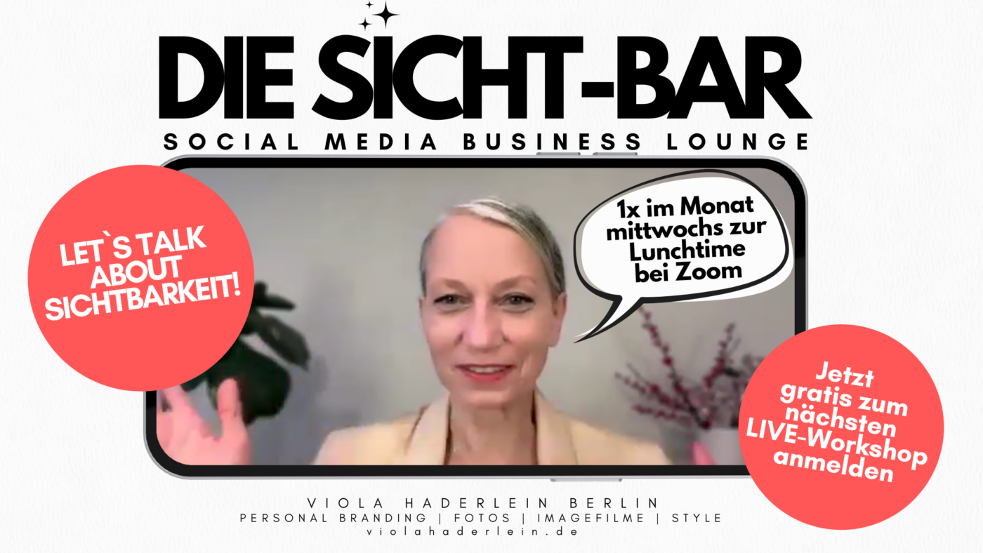 Wenn du mehr über meine neuen Sichtbarkeits-Strategien erfahren möchtest, dann komm in meinen monatlichen Workshop SICHT-BAR 50+. Hier erfährst du mehr über meine neuesten Strategien für wirksame und entspannte Sichtbarkeit – ganz ohne Insta-Burnout.